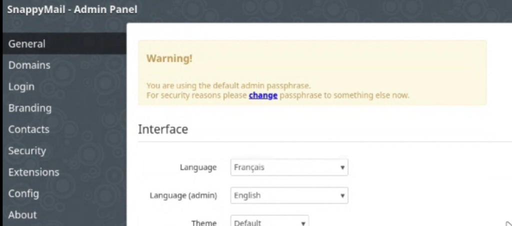 nano ~/mailserver-docker/docker-data/snappymail_data/_data_/_default_/configs/application.iniCherchez la valeur admin_password et supprimez le champ contenant le mot de passe chiffré. Rafraîchissez la page /?admin (https://FQDN.TLD/?admin). Un nouveau couple admin/password va être généré.