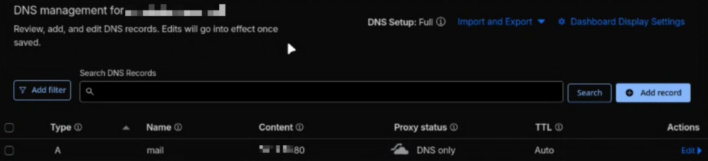 docker exec -ti mailserver setup email add postmaster@FQDN.TLD 'CHANGE-ME-PASSWORD'Mise en place des DNS