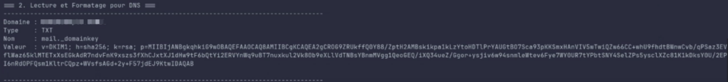 Juste pour information : le script récupère toutes les clés publiques à mettre dans le DNS de chaque domaine depuis le chemin suivant : cat docker-data/dms/config/opendkim/keys/FQDN.TLD/mail.txt