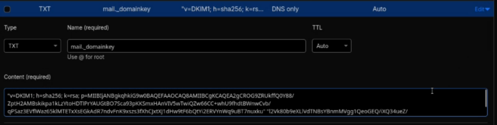 Rendez-vous sur votre hébergeur de domaine, puis créez un nouveau champ TXT avec le nom « mail._domainkey » et collez la valeur obtenue dans la partie « Valeur » du champ « Content » comme ceci :