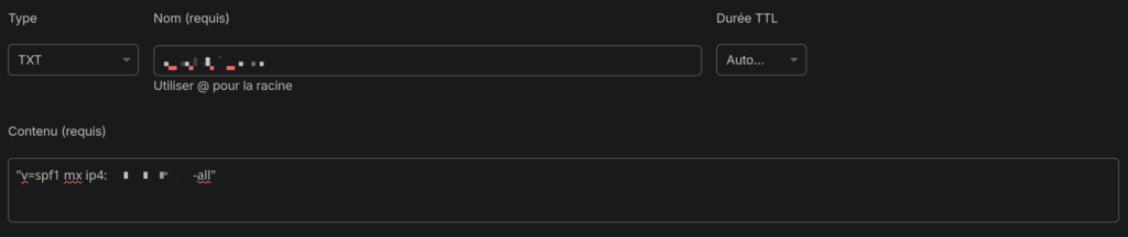 Contenu : v=spf1 a mx ip4:XX.XX.XX.XX ~all