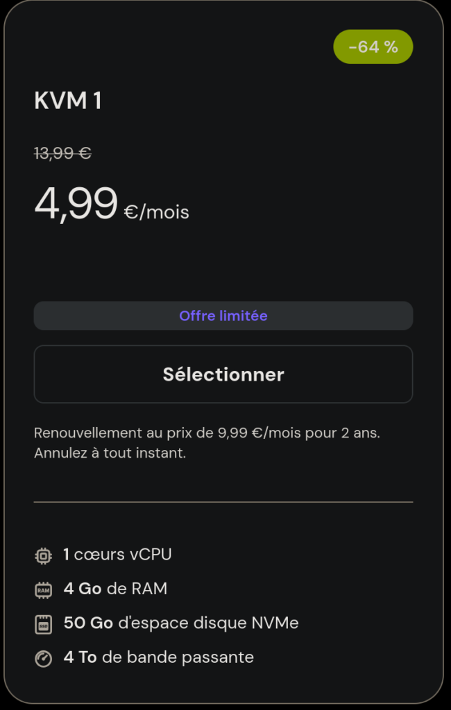 Pour trouver un VPS qui autorise l’utilisation du SMTP, rendez-vous sur https://www.hostinger.com/vps ou https://www.hostinger.com/vps-hosting puis choisissez le VPS le moins cher. Pour information, Hostinger possède certaines limitations dans l’envoi d’e-mails, cependant vous ne devriez jamais les atteindre dans le cas d’un home lab (voir les limitations).