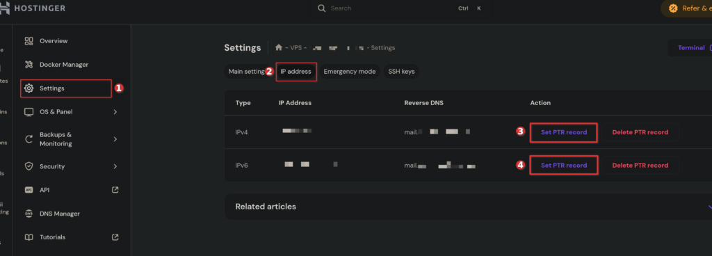 Sur le panneau d’administration de votre DNS, créez un champ de type « A » nommé « mail » qui pointe vers l’adresse IP de votre serveur Hostinger :